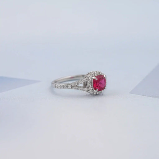 Ruby Cushion Gemstone Split Shank Halo Ring